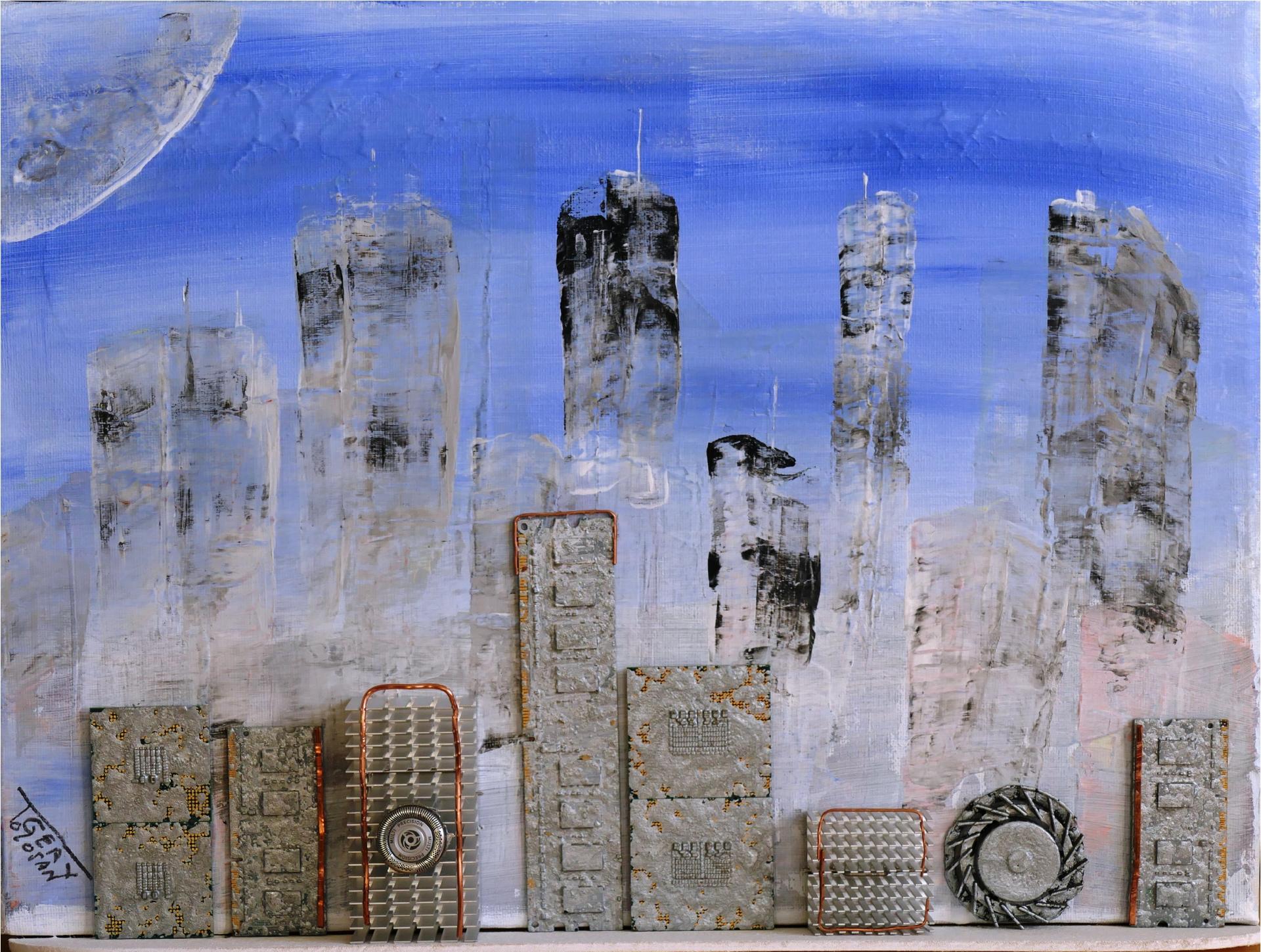 Villes de Science-Fiction, présentation artistique 3D avec des éléments d'ordinateurs en avant plan. Refroidisseurs, ventilateurs, mémoires, micro processeurs...